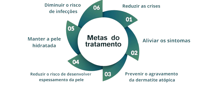 O tratamento da Dermatite atópica é feito de forma gradual e adaptado conforme a gravidade da doença e necessidades do paciente, tendo como meta proporcionar controle prolongado da doença e minimizar efeitos colaterais, promovendo melhor qualidade de vida. 8